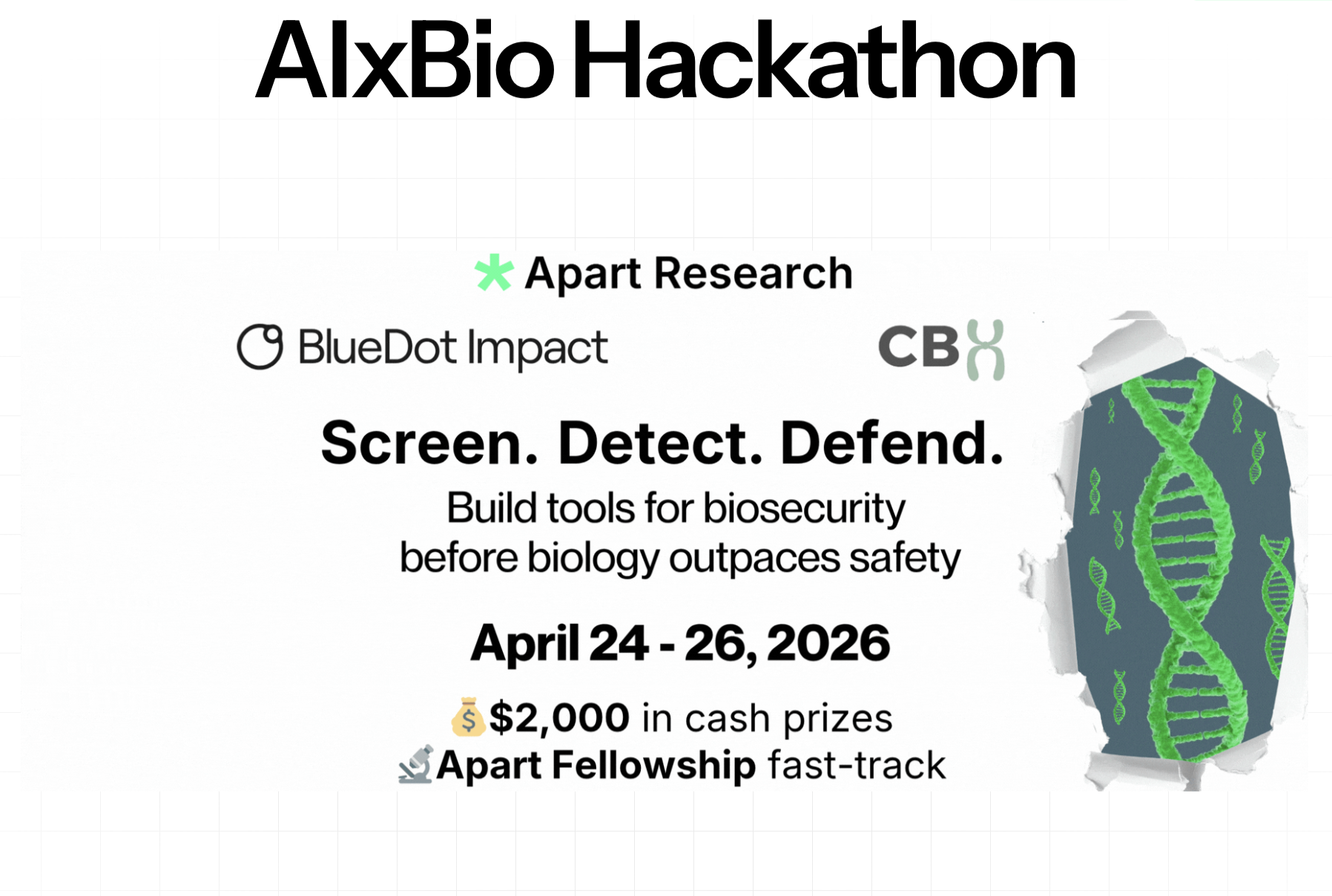 The Cambridge Biosecurity Hub is working with Blue Dot Impact and APART to organise an AIxBio hackathon on the weekend of 24-26th April focused on building tools for biosecurity.