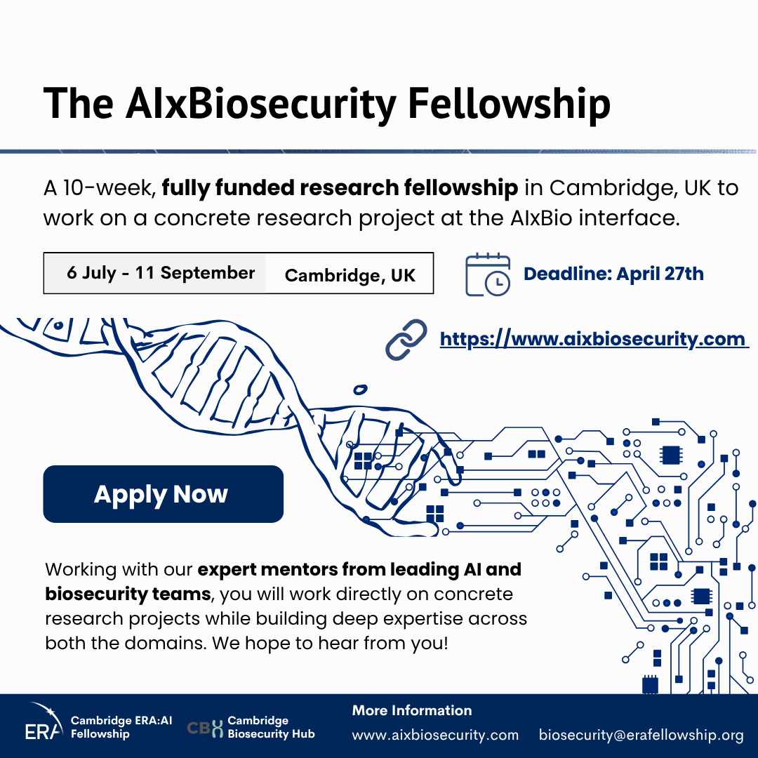 ERA, in partnership with the Cambridge Biosecurity Hub, is launching a 10-week, full-time, and fully funded AIxBiosecurity research fellowship dedicated to tackling biosecurity risks amplified by recent advances in frontier AI capabilities. Our programme equips researchers to investigate ways to reduce extreme risks from engineered and natural biological threats amid rapidly advancing biotechnology and emerging AI capabilities. After a successful 2 month pilot programme, we’re excited to continue working with some of the top talent in the field.