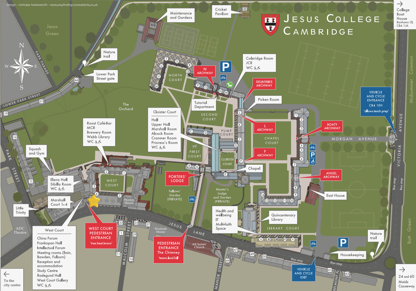 Please enter Jesus College from the West Court Pedestrian Entrance on Jesus Lane (see star on image below).