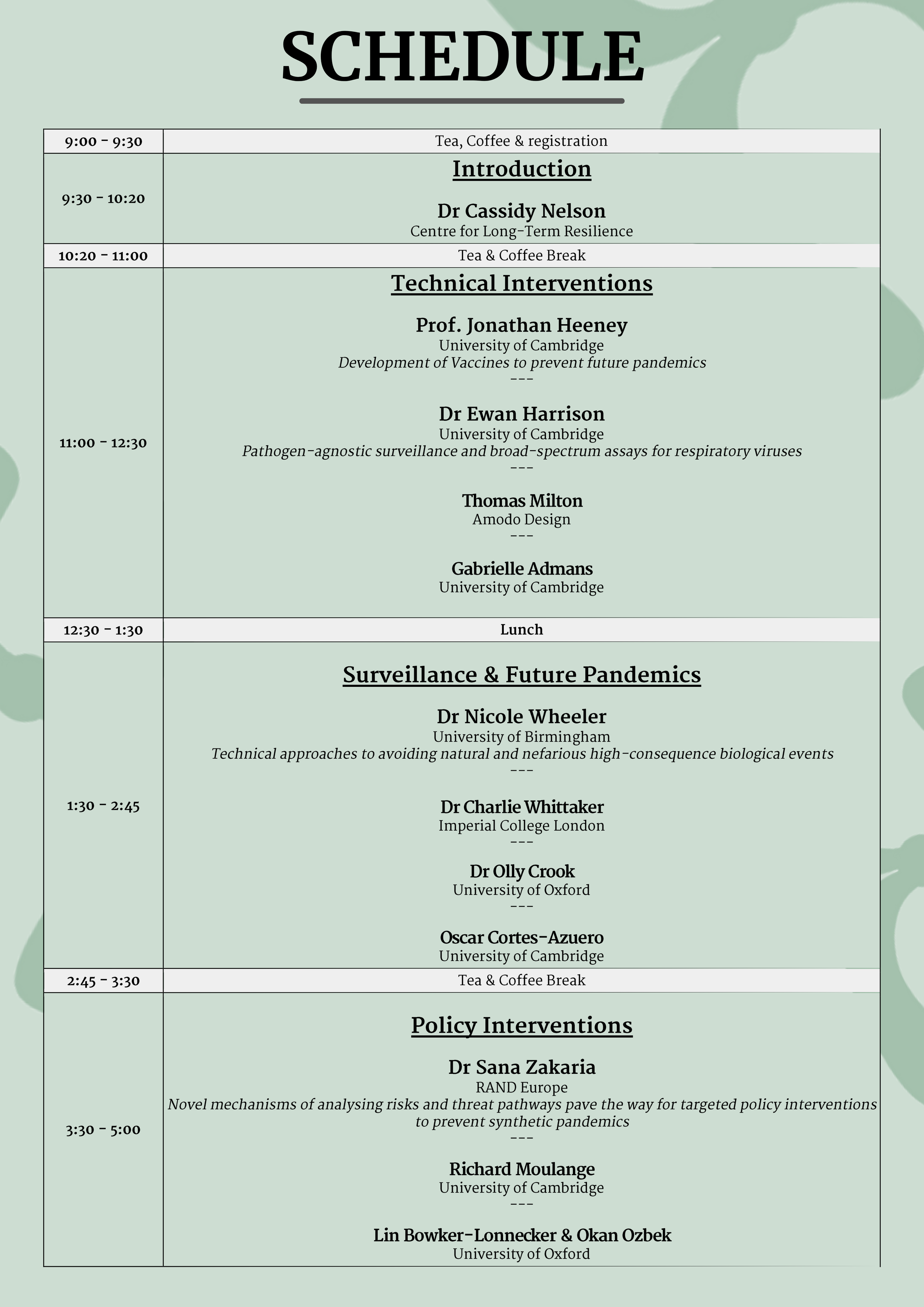 The Cambridge Biosecurity Hub (CBH) alongside Cambridge Infectious Diseases (CID) are excited to announce our Pandemic Prevention Symposium. The Symposium will be held at Jesus College, Cambridge on the 7th of October with all welcome to attend. Talks from junior and senior researchers will be combined with flash talks and poster presentations from PhDs and postdocs.